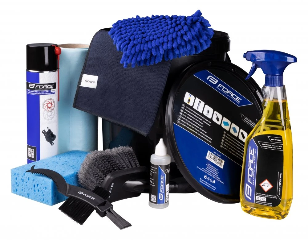 The set includes: 15 l bucket, washing sponge, Force cleaner with spray, Froce non-woven cloths, chain grease, high brush, small cartridge brush, microfiber cleaning gloves, microfiber cloth, brake cleaner.