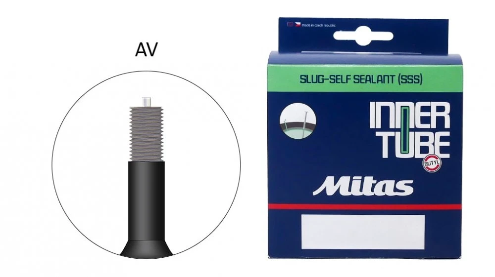 Classic tube from the Czech manufacturer Mitas (Rubena) with a 35 mm long auto valve and anti-defect sealant inside.