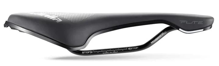 Road saddle with a flat shape and compact dimensions for maximum stability when pedaling.