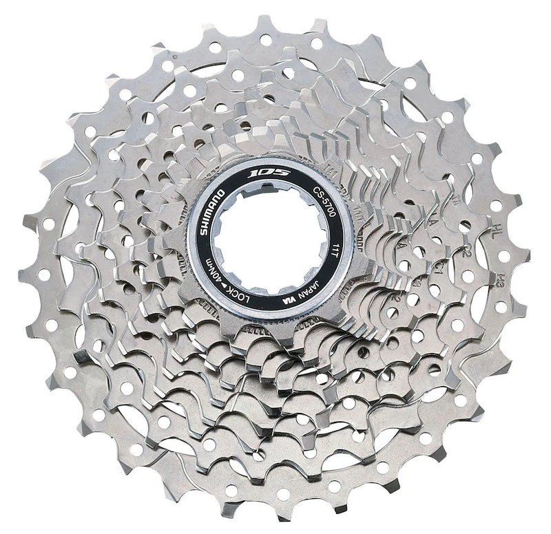10-speed cassette, nickel-plated steel pinions, pinion carrier made of light aluminum alloy, computer-designed teeth for easy shifting, set 105, 245 g.