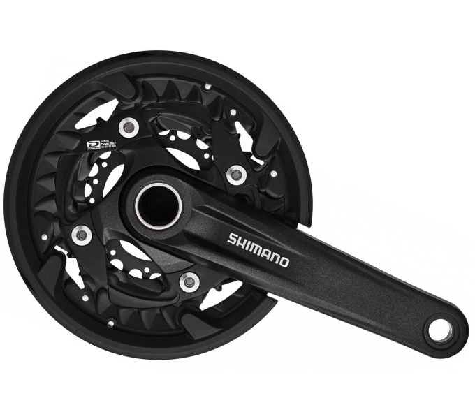 Two-piece MTB cranks with integrated axis for 3×10 speeds.