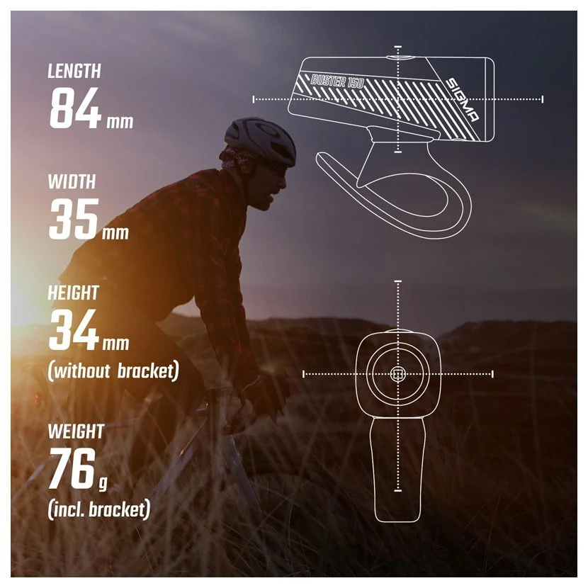 - 5 light modes: High (150 lm), Mid (75 lm), Low (35 lm), Night Flashing (100/40 lm), Day Flashing (40 lm)