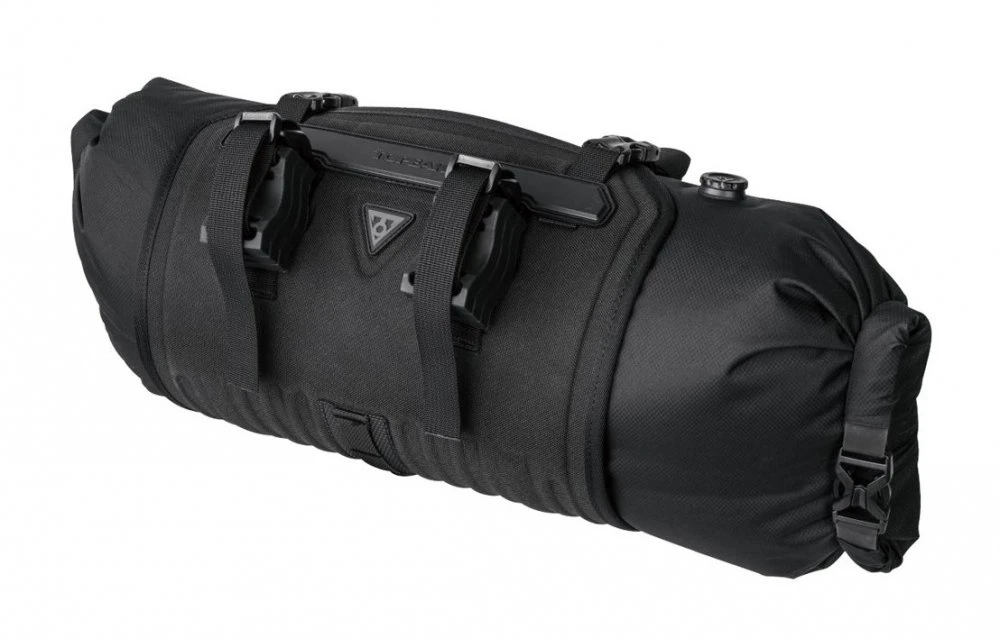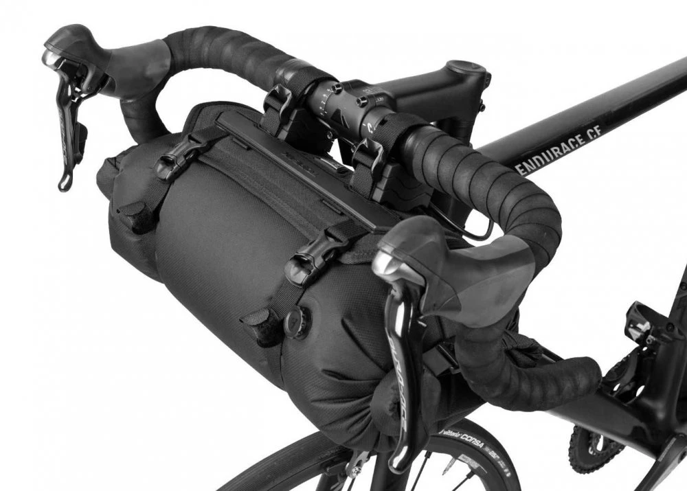 Handlebar bag made of durable and waterproof materials, which can hold light but bulky items such as sleeping bags, camping equipment and spare clothes.