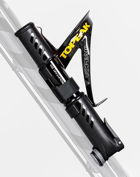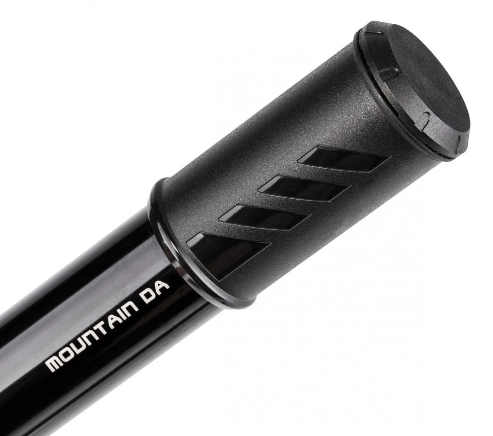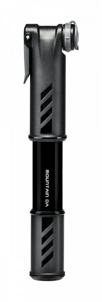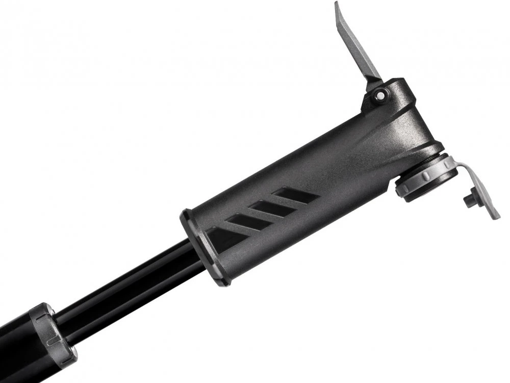 Powerful pocket pump with manometer, aluminum body and plastic handle, uses both strokes to compress the air and save time and effort.